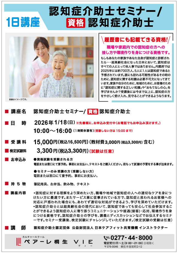 1日資格取得講座(認知症セミナー/認知症介助士)受講生募集!